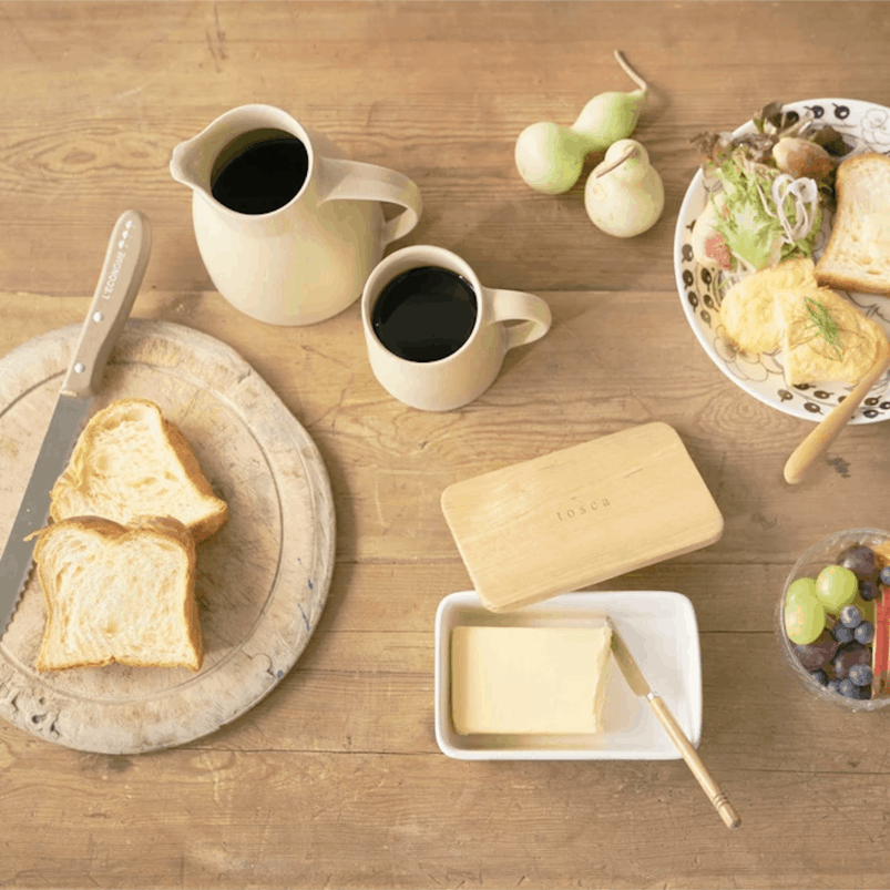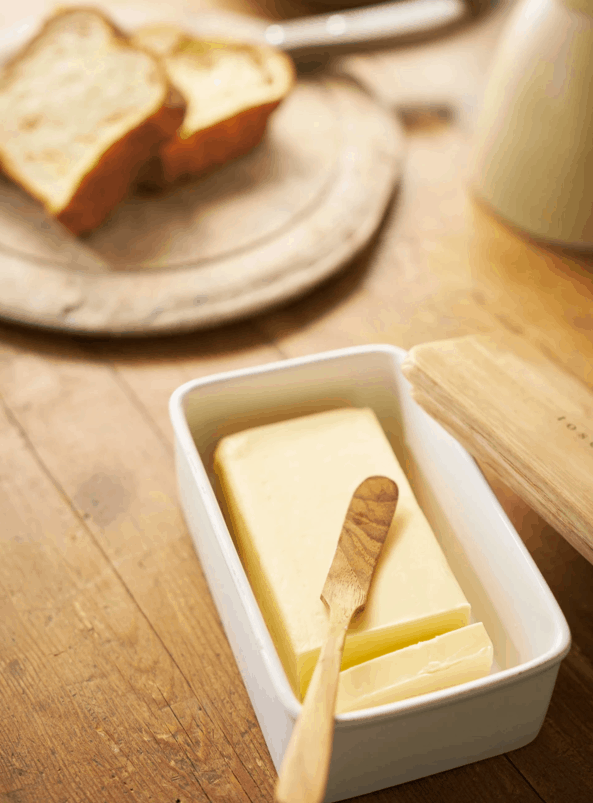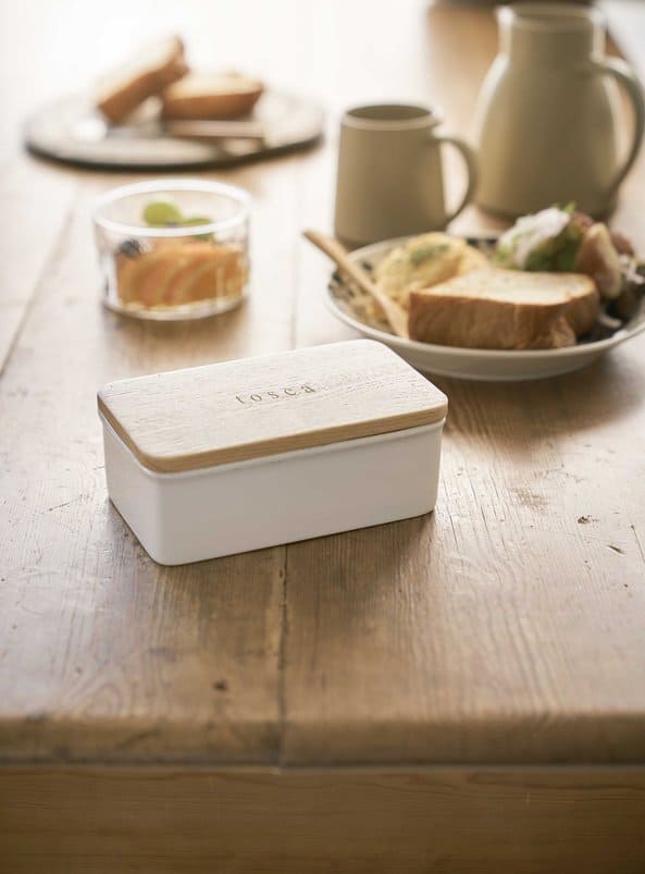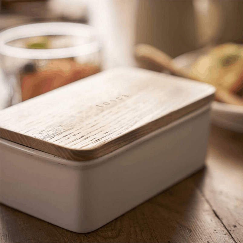 Freshly toasted bread goes well with soft butter. Ceramic bowl with wooden lid from the Tosca range.