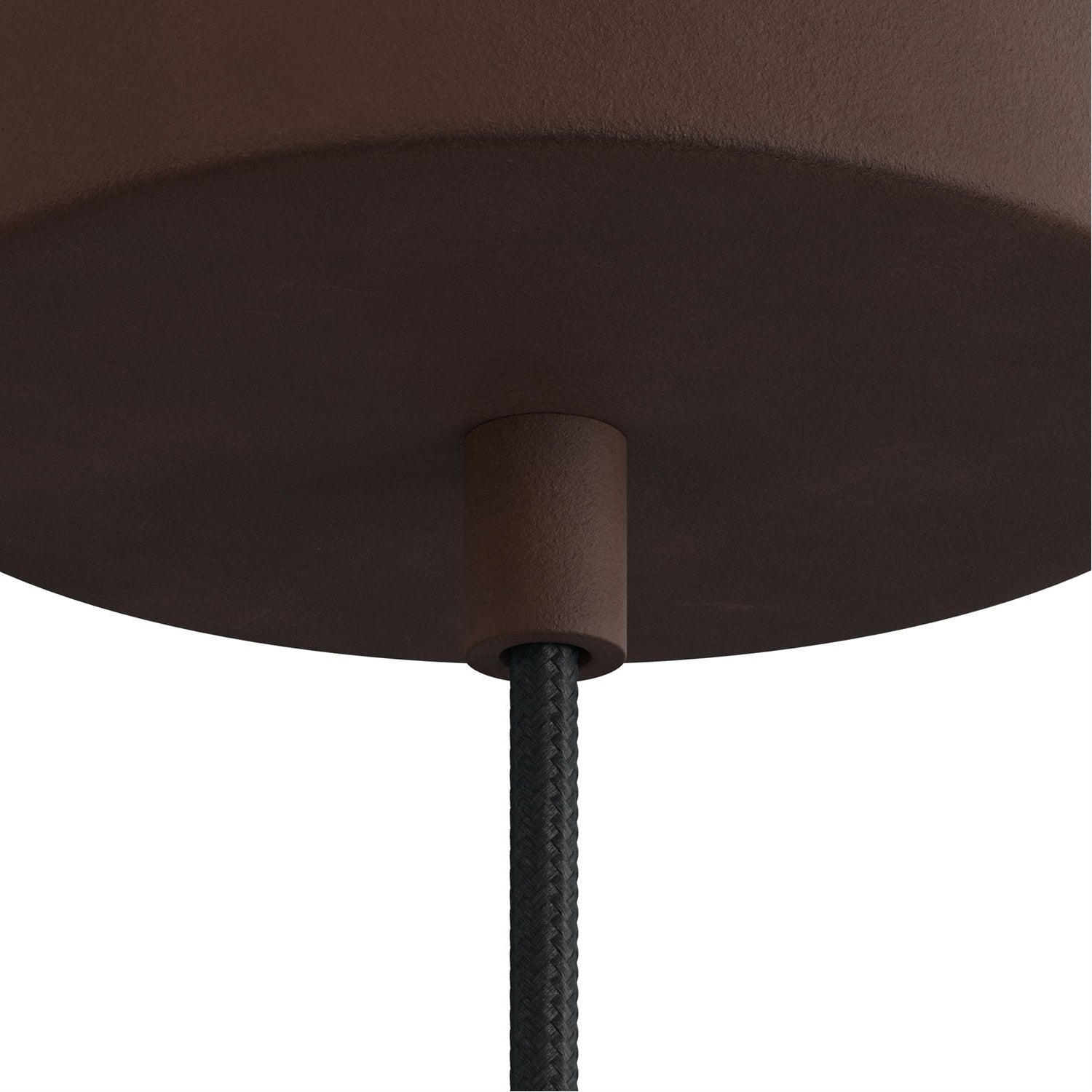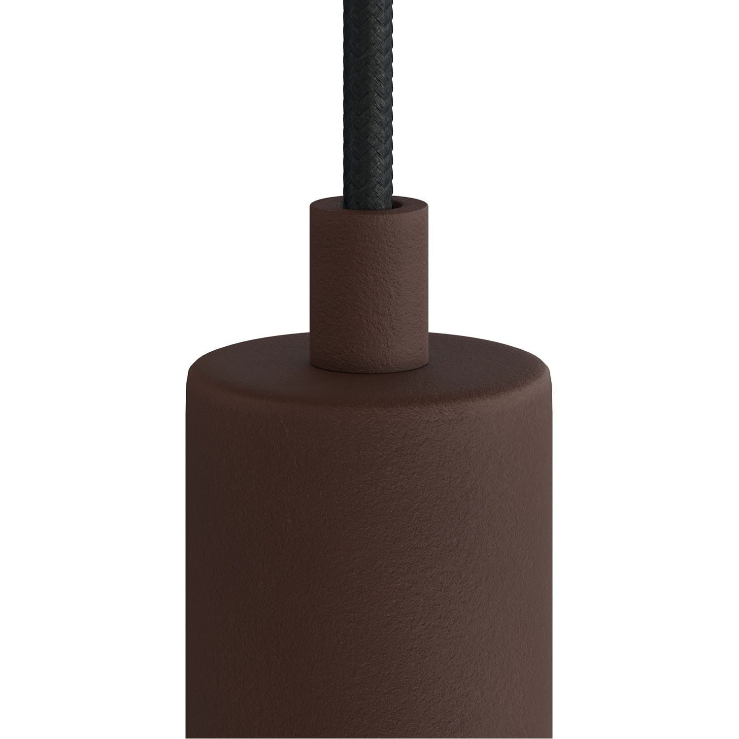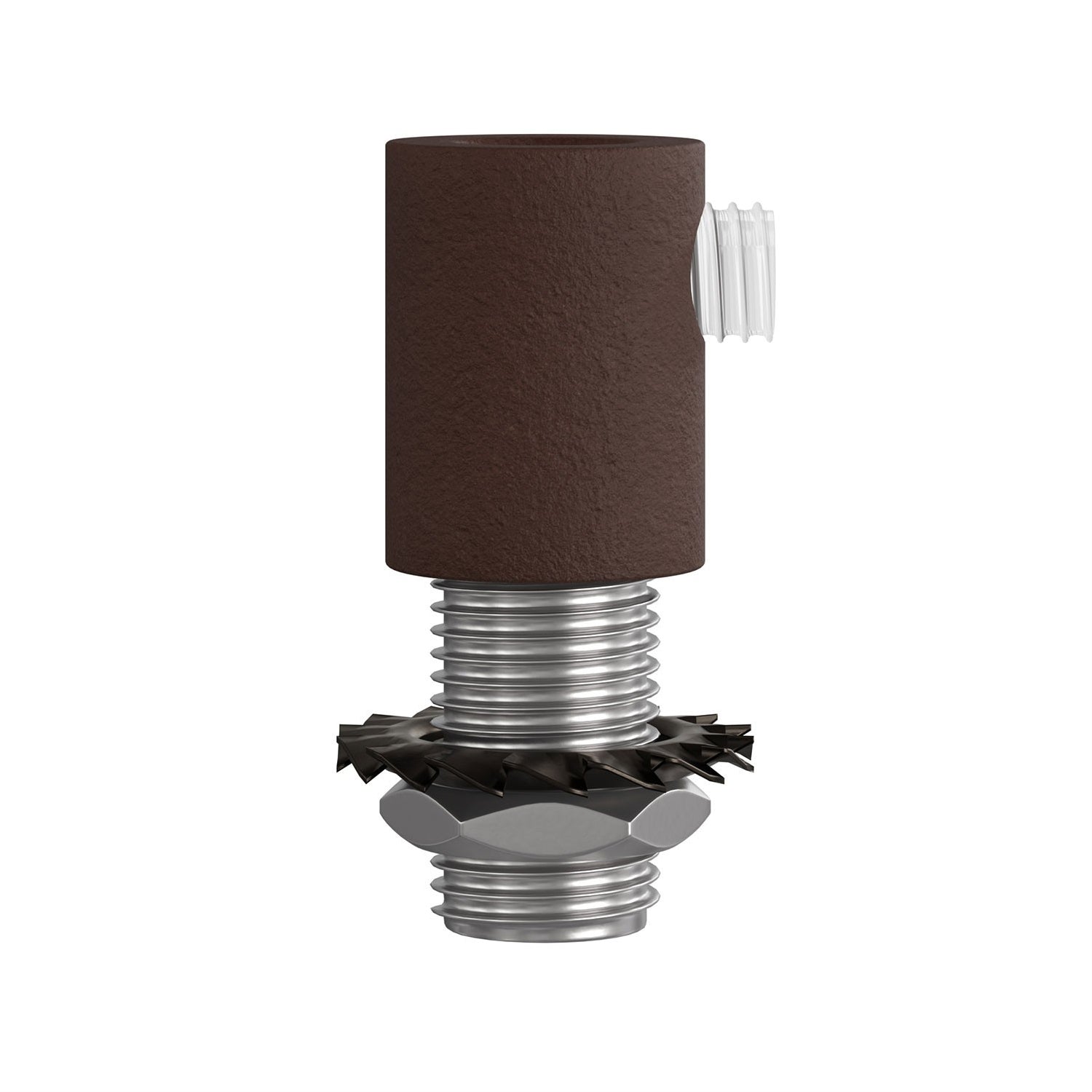 Dark rust metal cord retainer with thread and nut, screwed into the bulb holder or ceiling cover.